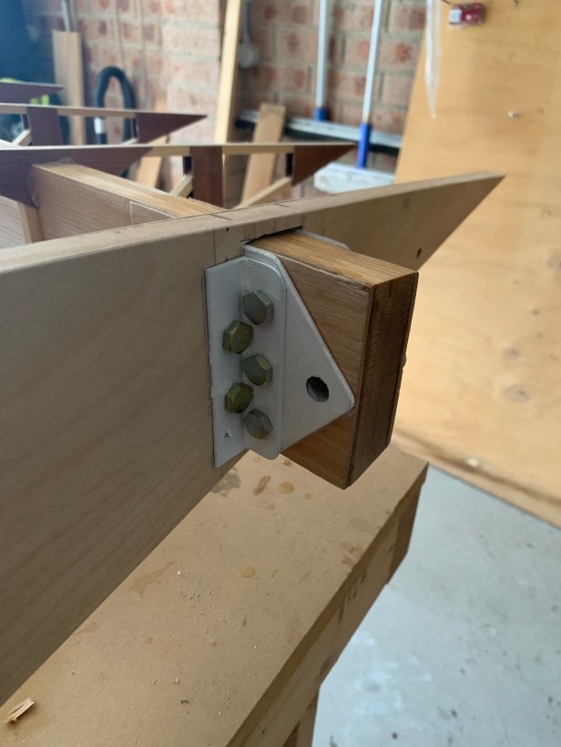 Slow going but still doing this butt rib end. This end shows then 4130 spar plates and aluminium right angle that fixes the butt rib to the spars. What was difficult is the 6.5 degree sweep back because it means that getting a bolt on or a socket is hard as the rib does not sit at right angles to the spar. This meant a few false starts in passing bolts through and getting nuts on. Anyway rear spar is done. I have used AN 4 bolts for the through bolts, but perhaps could have used AN 3. Bolt dimensions not called out in the Delta plans.